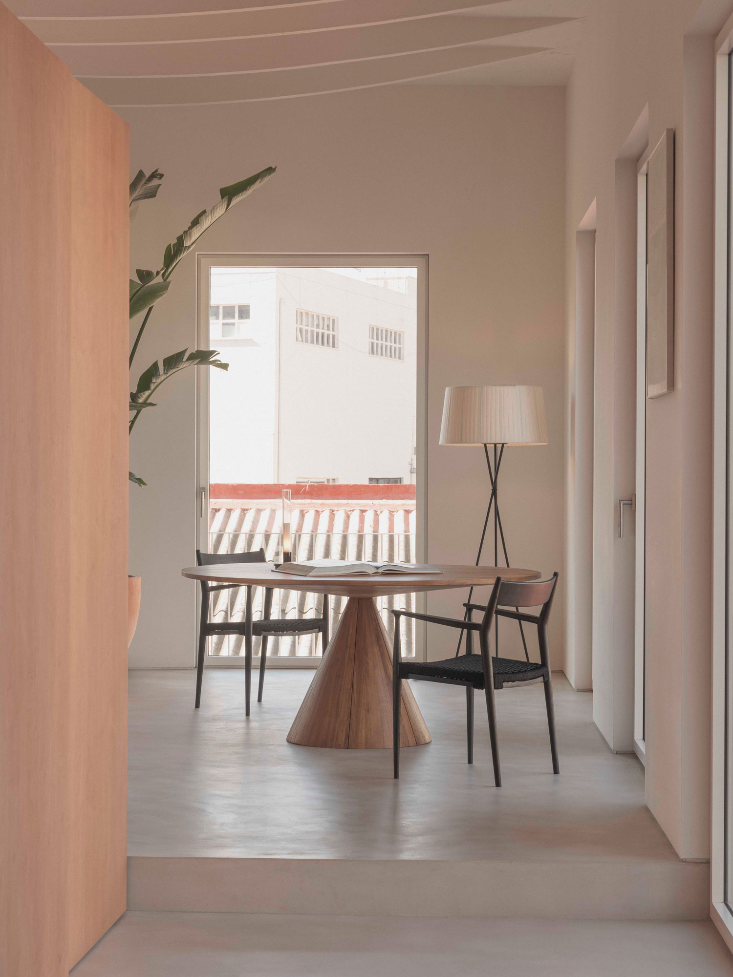 Taula rodona Conic de Ø160 cm i cadira Manui de PLM Design; llum de sobretaula portàtil Sylvestrina i llum de peu Trípode de Santa & Cole.