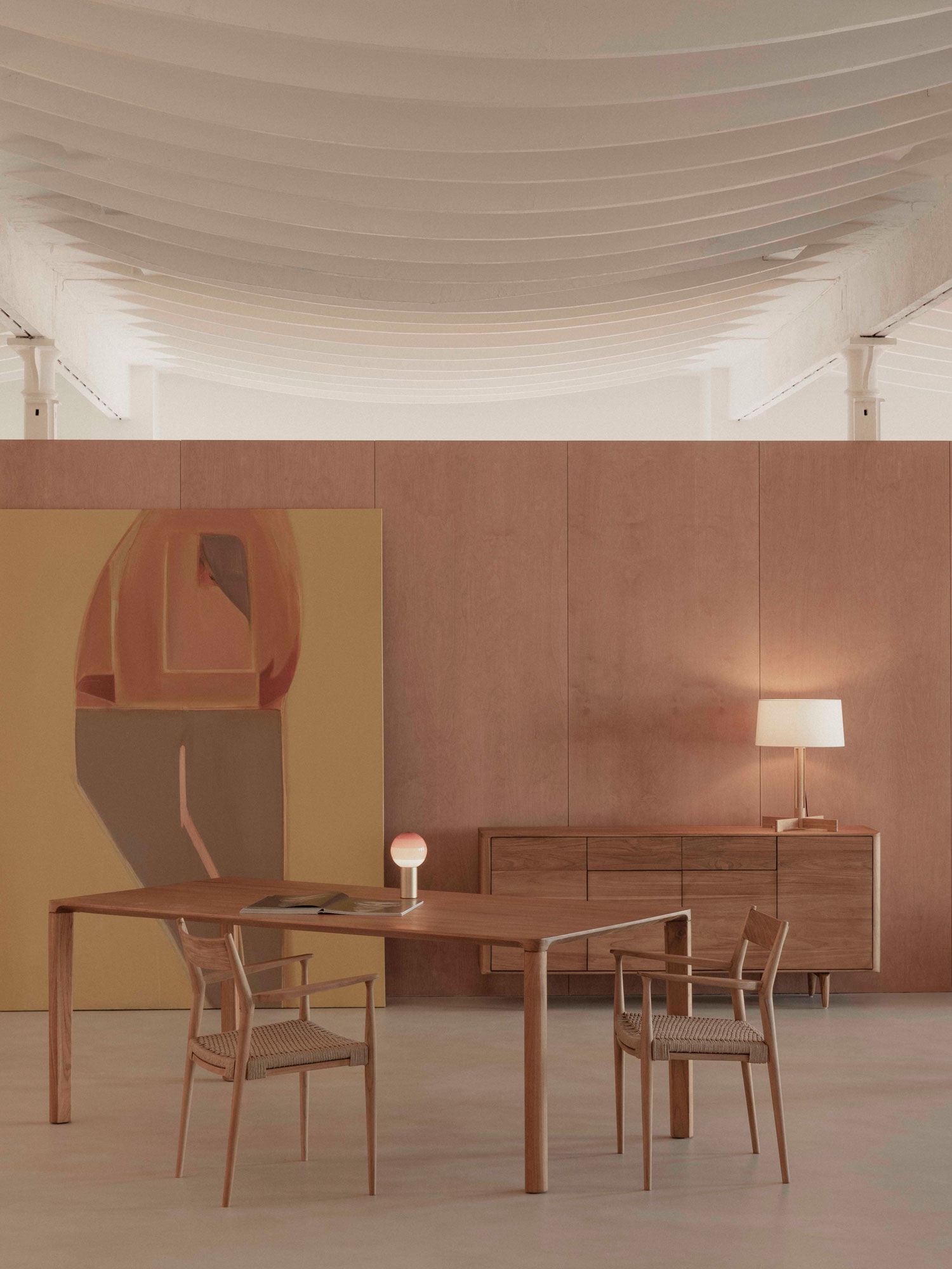 Taula Pure, cadira Manui i bufet Etna de PLM Design; llum de sobretaula Fad de Santa Cole i llum portàtil de sobretaula Dipping Light de Marset.
