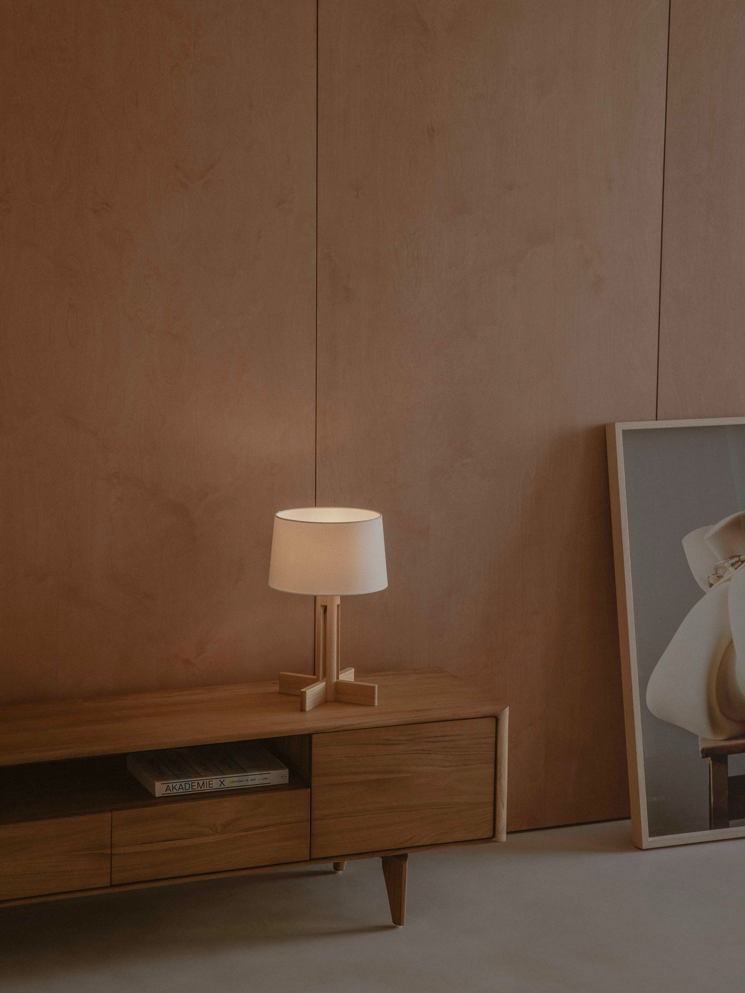 Mueble TV Etna de PLM Design y lámpara de sobremesa FAD de Santa & Cole.