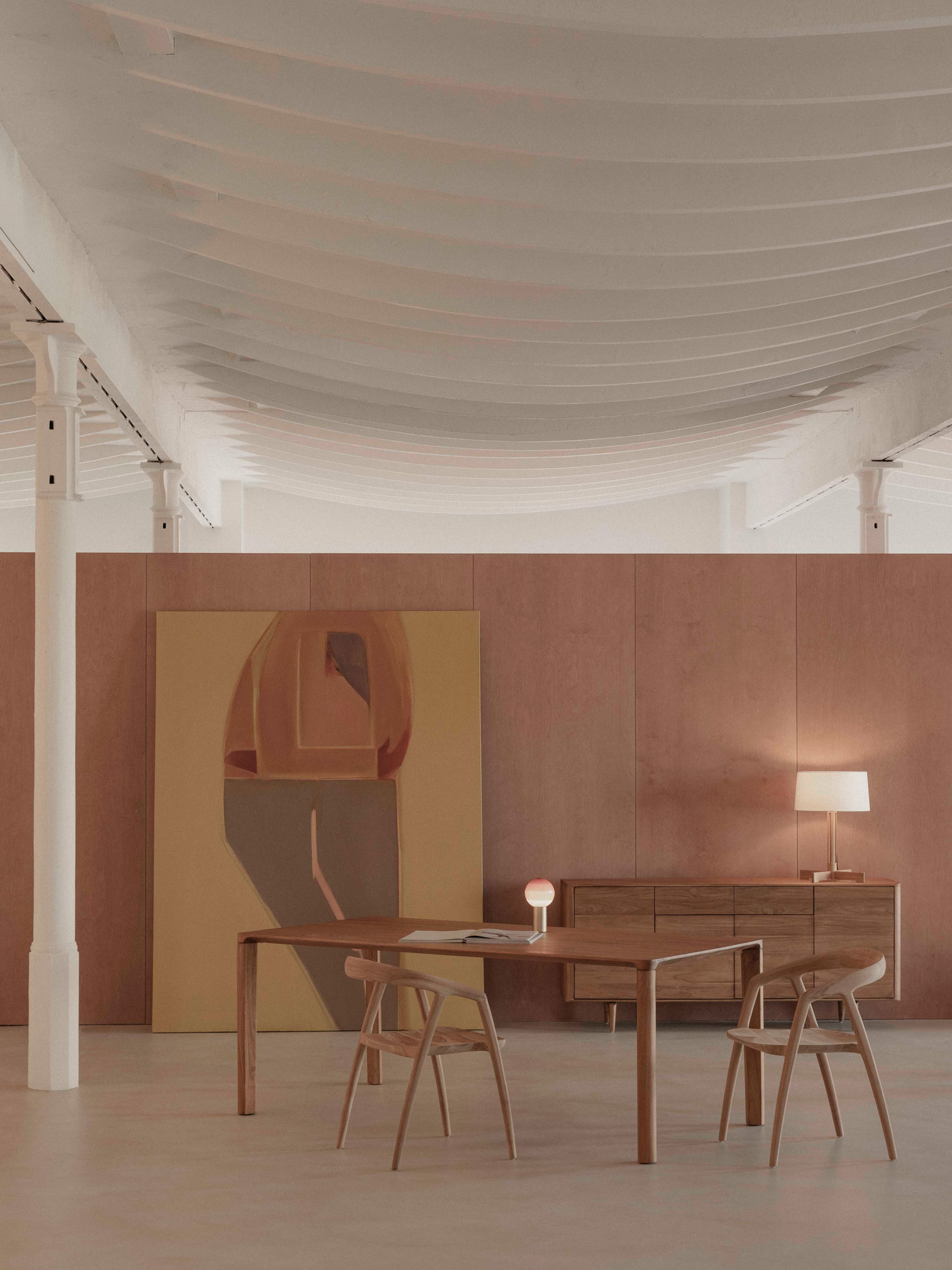 Aparador Etna de PLM Design y lámpara de sobremesa FAD de Santa & Cole. Mesa Epure, silla Nusa de PLM Design y lámpara de sobremesa Dipping Light de Marset.