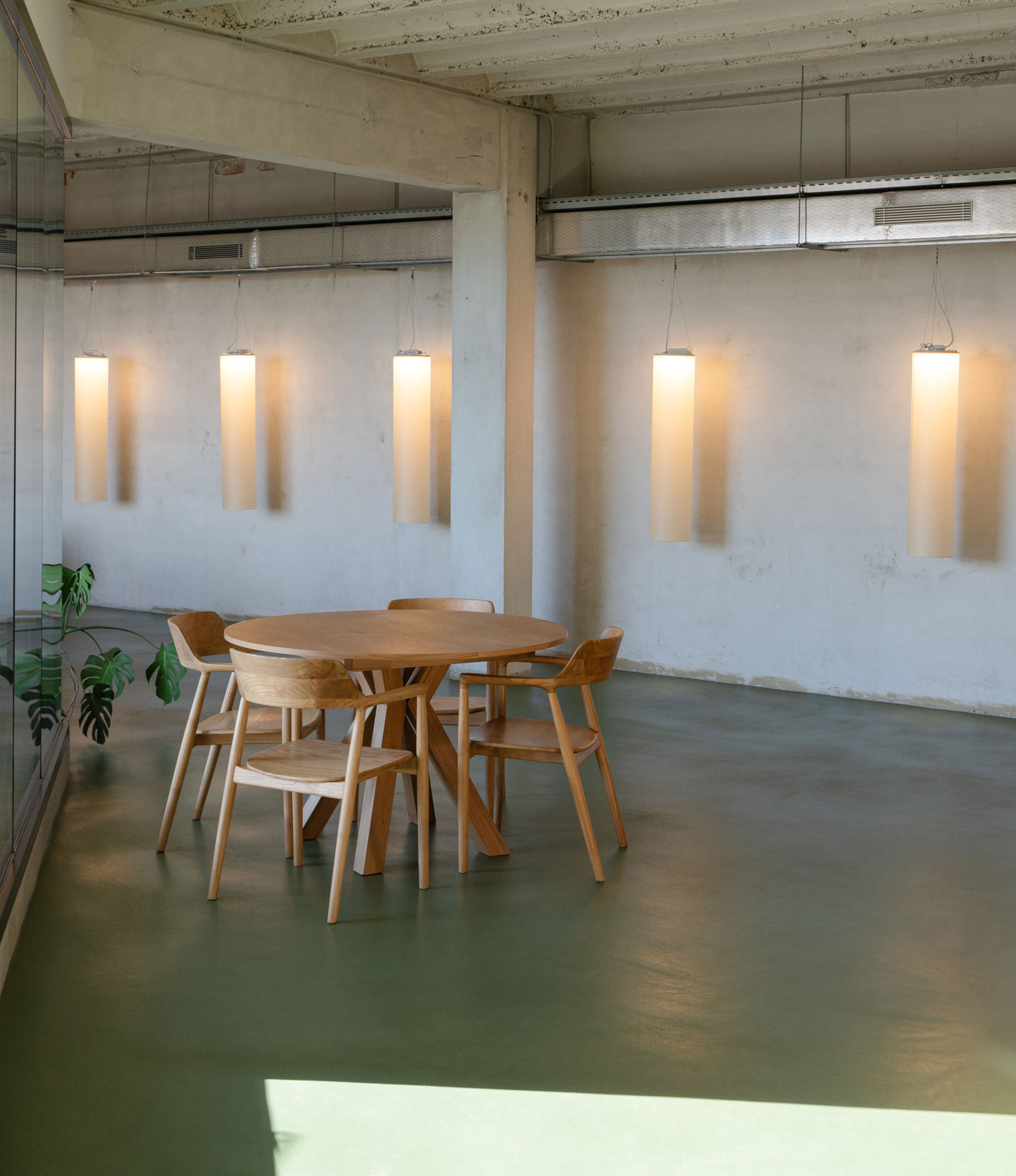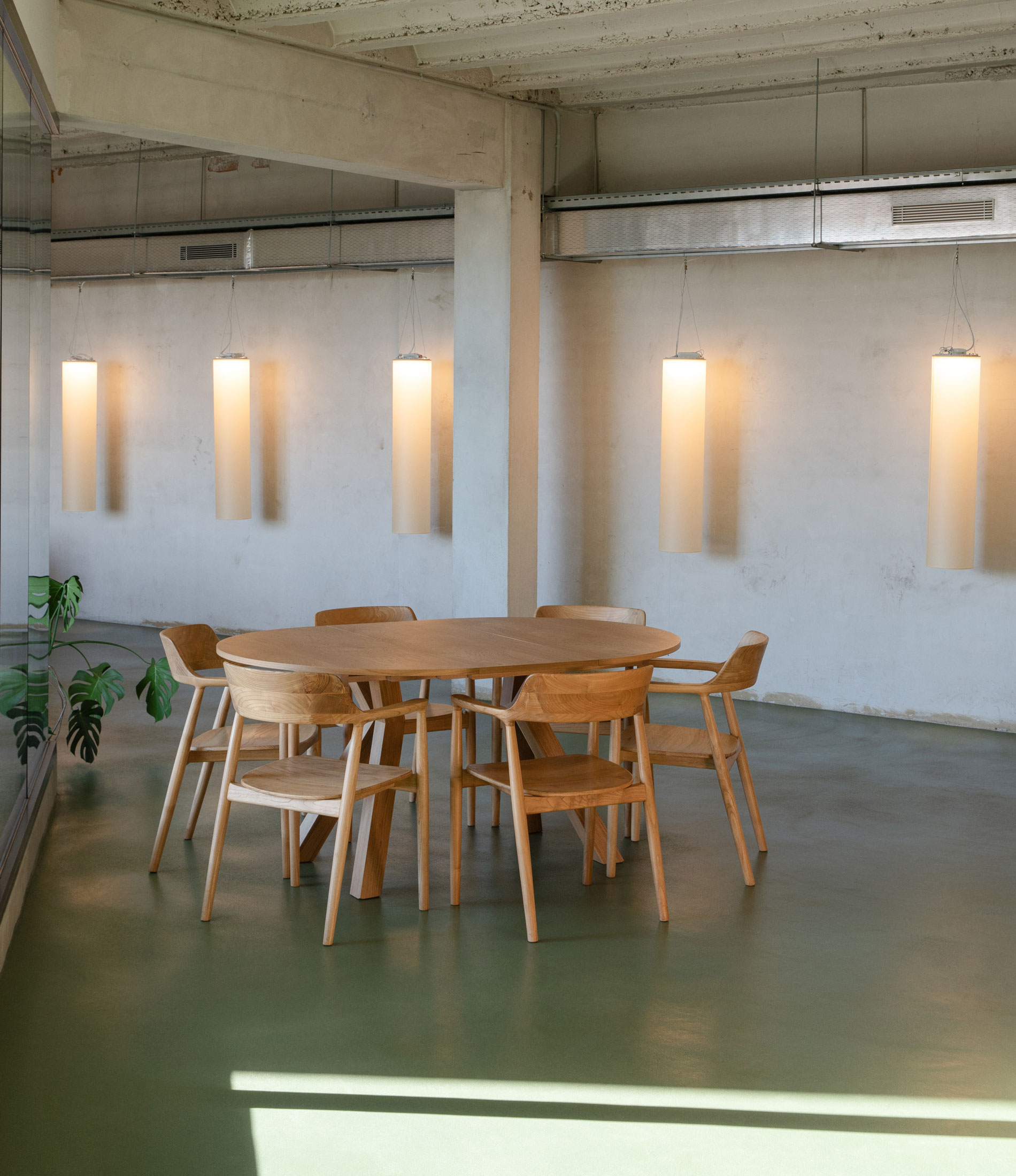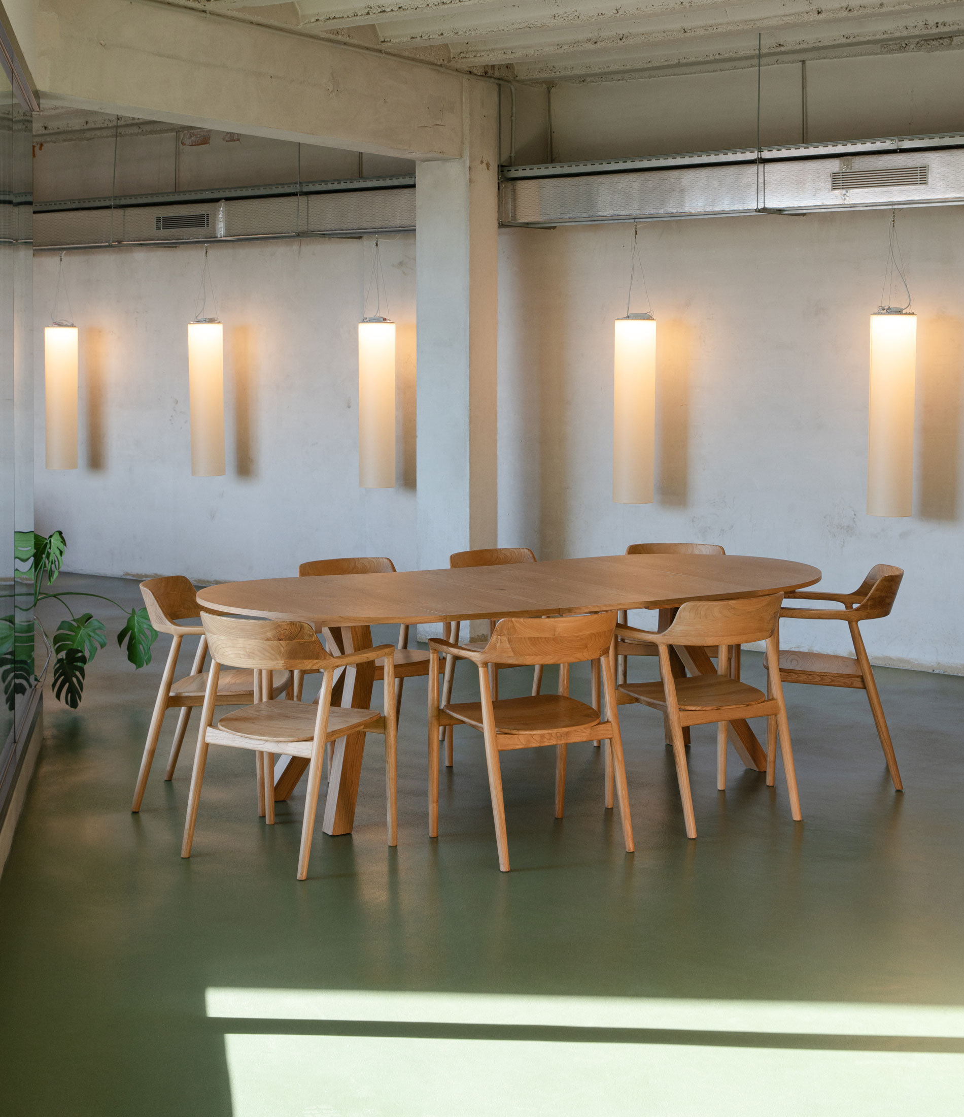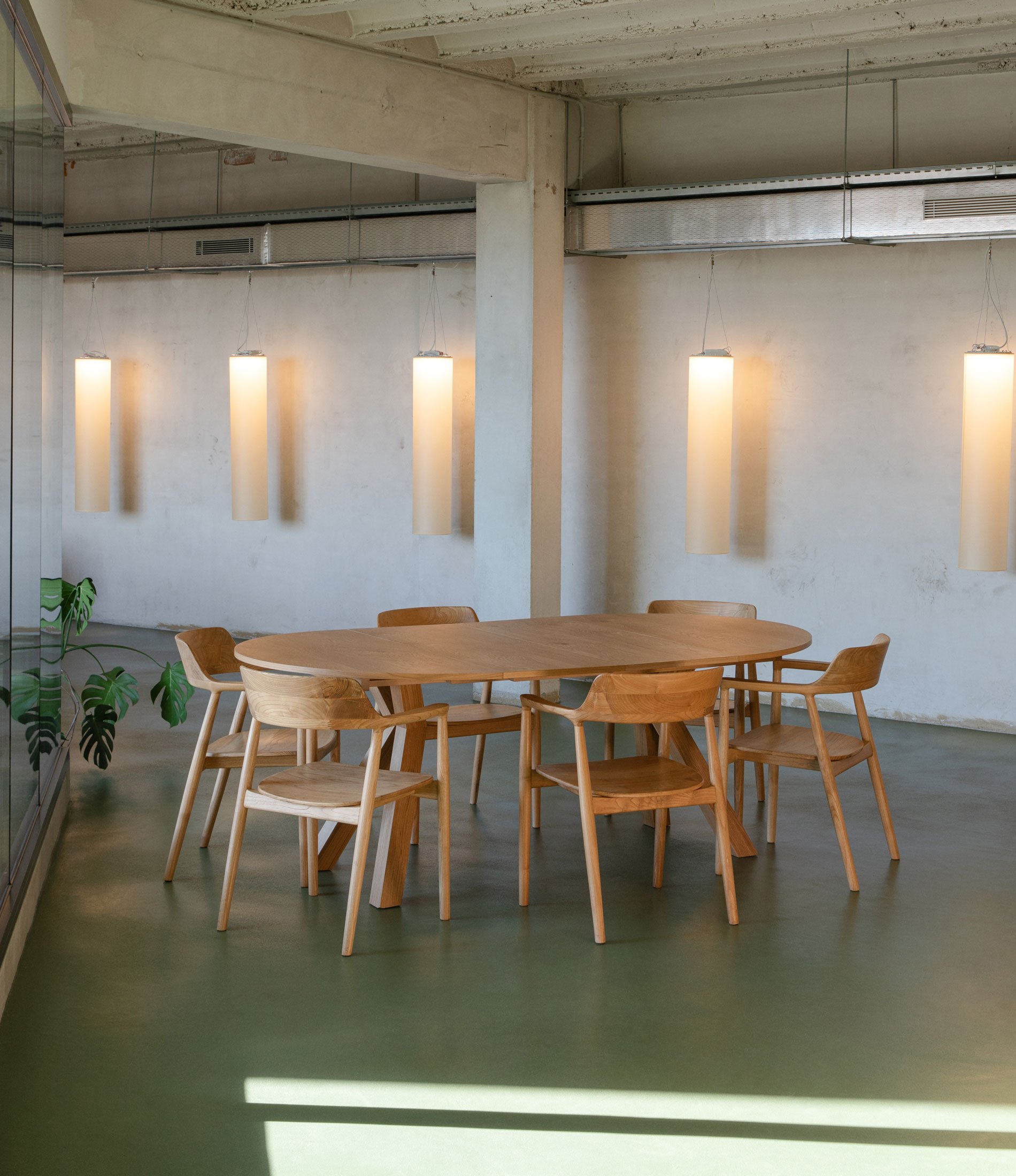 Silla Hiro de sungkai y mesa extensible Iris de roble natural disponible en 3 acabados de PLM Design.